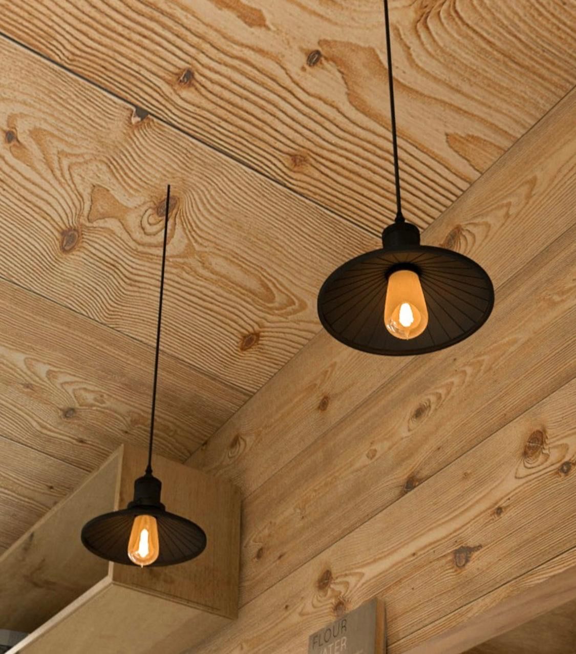 Materiais como pisos de pinho, paredes de madeira e acessórios pretos dão um visual moderno e sofisticado.