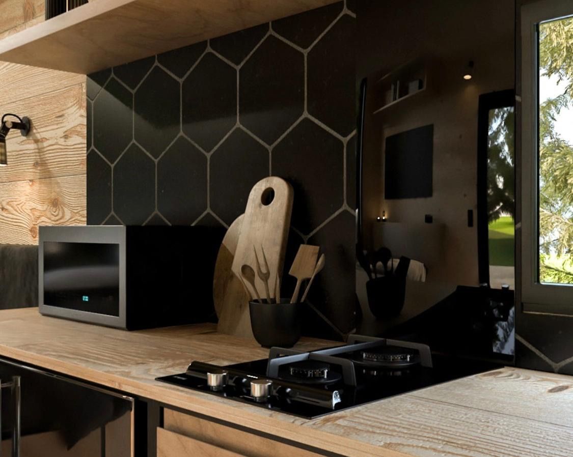 Cozinha eficiente: possui balcões de madeira maciça, exaustor embutido, fogão, aquecedor de água, forno, pia de cerâmica preta com torneira moderna - compacta, mas totalmente funcional para cozinhar diariamente.